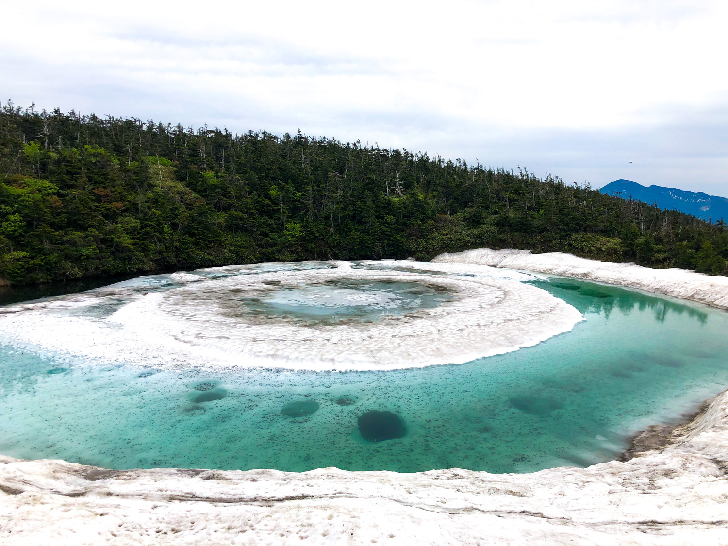 鏡沼位於秋田縣與岩手縣交界處的「八幡平」山頂,是觀賞期間極短的稀有景色,冬天因積雪被覆蓋的鏡沼,到了春天,積雪從邊緣和中心部分開始融化,形成宛若甜甜圈的形狀,水面閃耀的翡翠綠光澤與白雪相輝映,交織出了神秘且美麗的景象,由於其樣貌酷似巨龍的眼睛,因此又被稱為「龍之眼」。