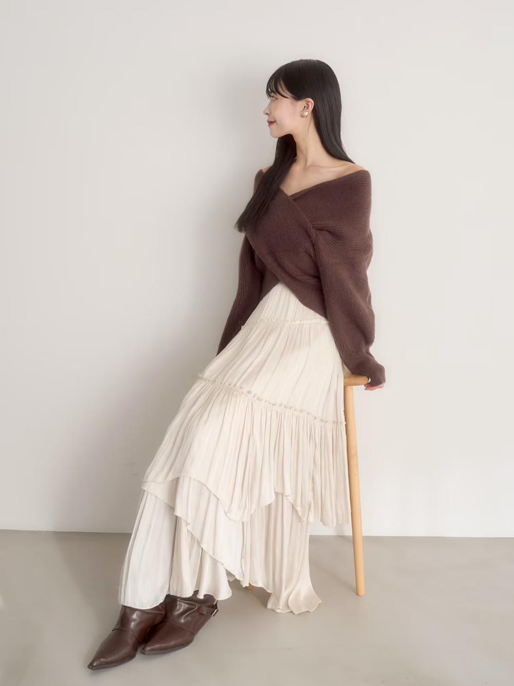從 V 領到斜肩設計的上衣,能露出肩膀與鎖骨線條,看起來非常顯優雅知性,融入巧克力色的軟呢材質,同時為整體注入一股溫柔高級感,如果想讓造型更凸顯細緻品味的話,不妨嘗試以白色長裙混搭,再踏上短靴就很好看加分。