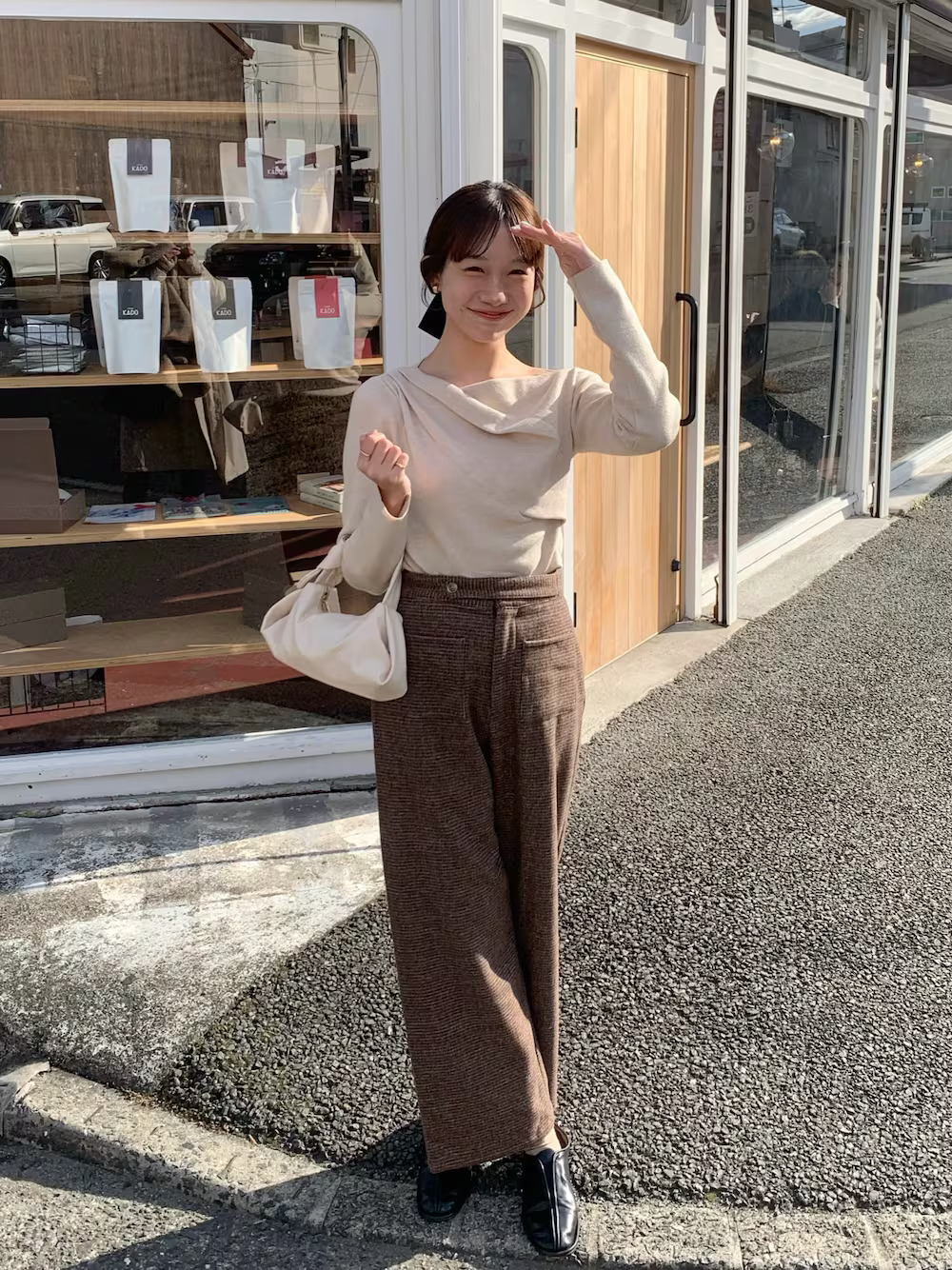 通勤約會皆可穿的巧克力色西裝休閒長褲,百搭好駕馭又不挑人穿,成為許多日本女生內心的最愛單品之一,融入巧克力色調,加乘出低調簡約的率性質感,上衣不論選搭露肩上衣或者襯衫疊搭,使上班約會都能擁有迷人的穿搭魅力。
