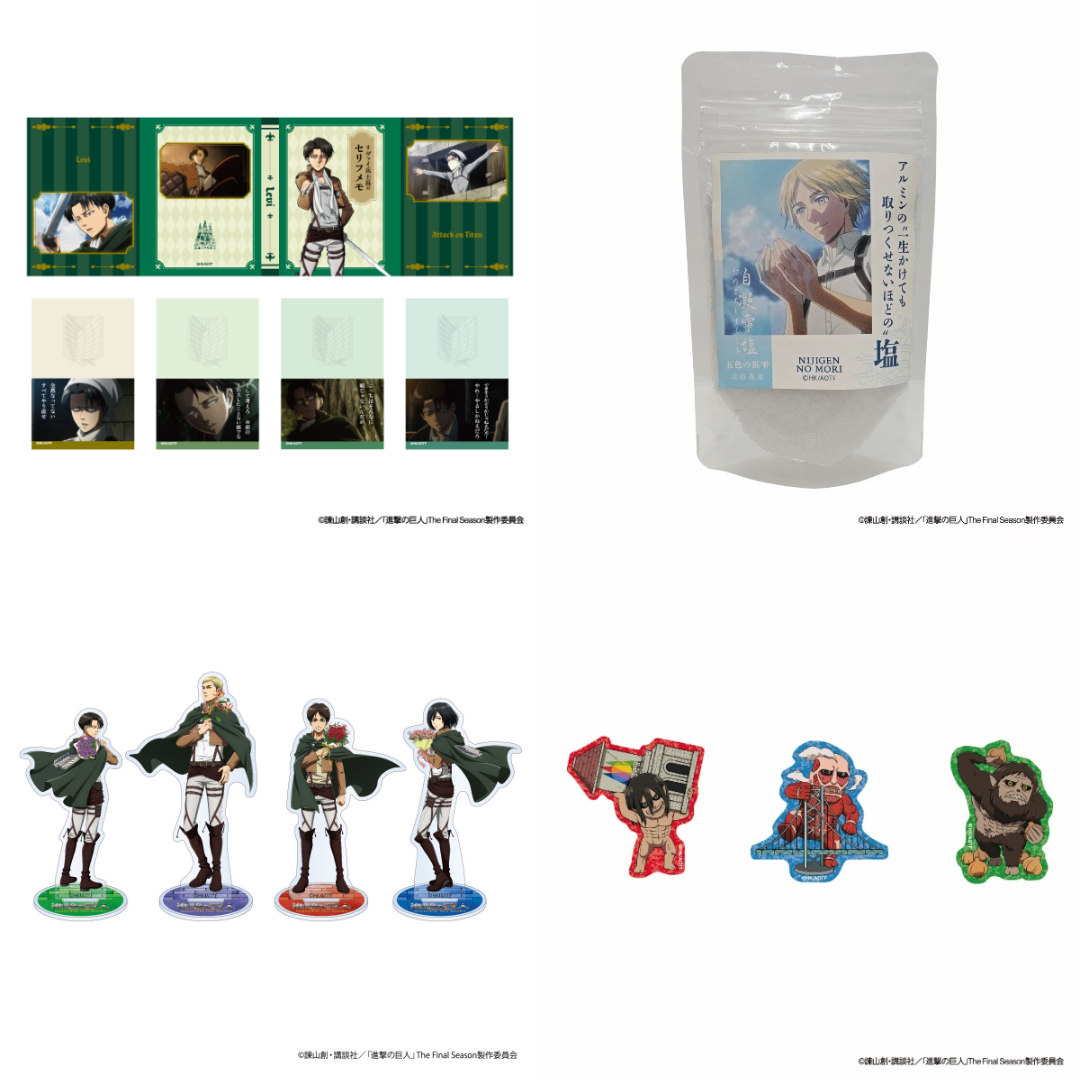 另外,還有充滿巧思、粉絲必收的小彩蛋商品,例如「里維兵長的台詞便條紙」、以及「阿爾敏的『一輩子都用不完的』鹽」等在內,合計36款原創合作商品 將一次登場。
