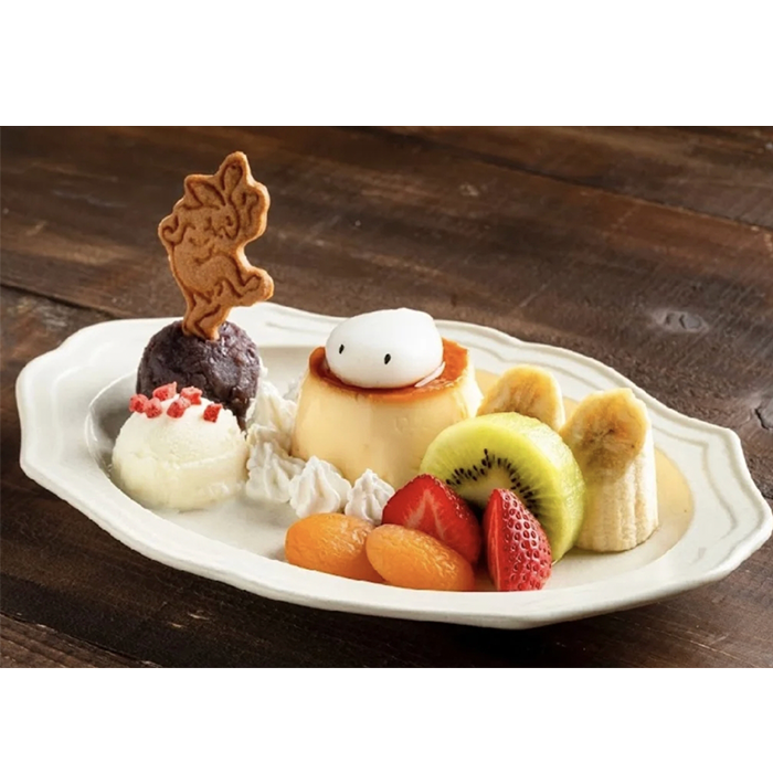 還有配料相當豐富的布丁拼盤,有餅乾、冰淇淋、鮮奶油、紅豆餡,以及各種水果點綴,其中布丁上方還有一顆水大福,而這顆水大福也可以加價更換為草莓紅豆內餡的妖怪大福。
