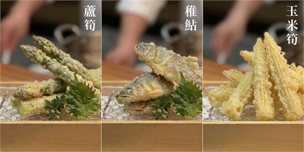 ■ 蘆筍(4月至6月):這時期的蘆筍極粗卻驚人地柔軟。在麵衣中呈「悶蒸」狀態的蘆筍,連根部都飽滿多汁,喝起來宛如天然的高湯。