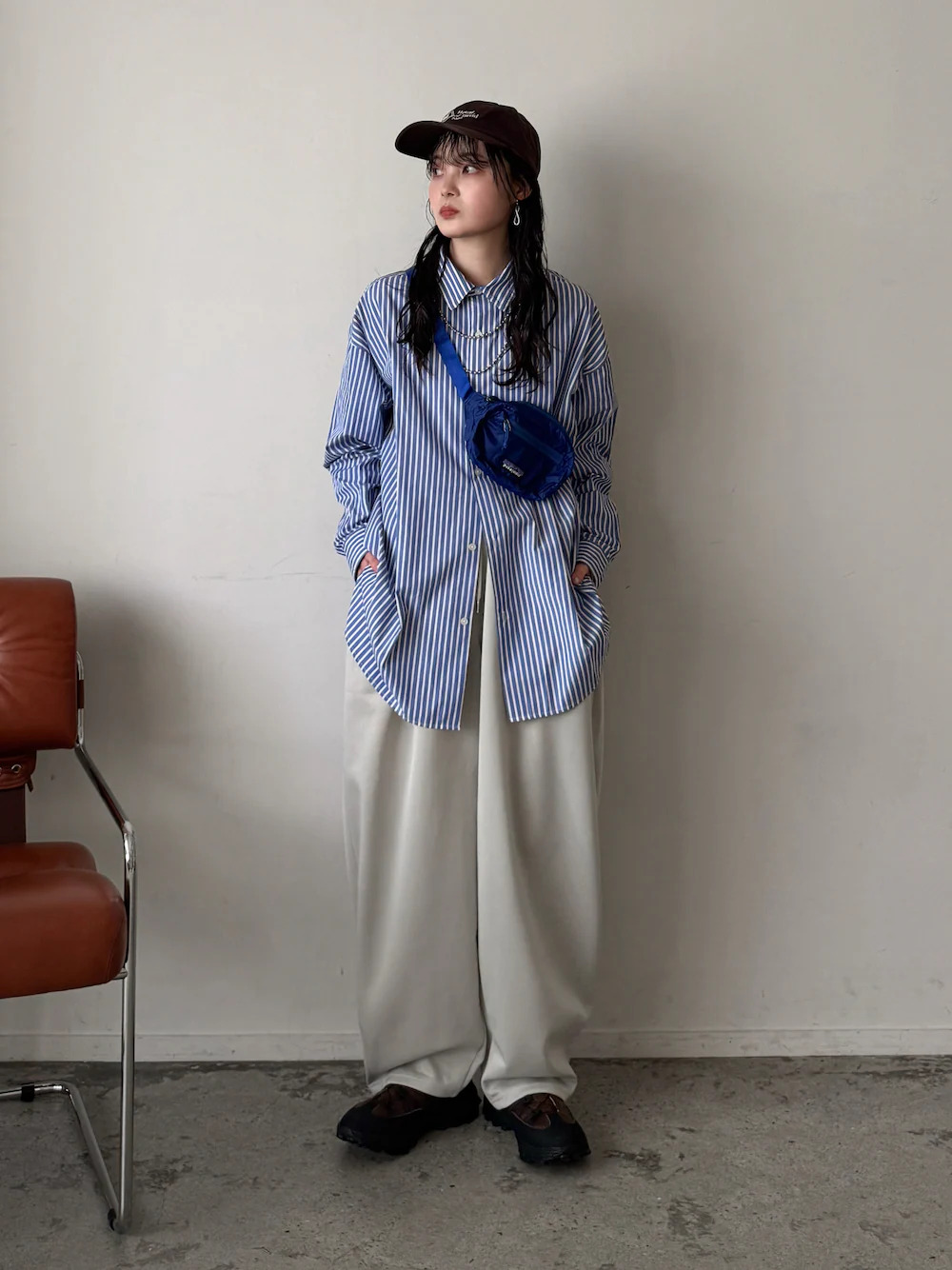 近期成為日本女生外出衣著必備的棉質長褲,舒適的面料非常適合春季時著用,融入寬管的褲型,使造型注入一股輕鬆隨性的迷人氣息,選擇藍色直條紋襯衫混合,使正式與休閒的單品,瞬間撞擊出不一樣的風格火花。
