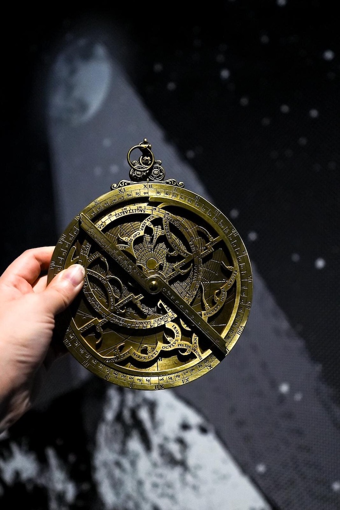 特別設置的拍照打卡區域,以黑白線條描繪的夜空作為背景,充滿漫畫風格的獨特魅力。參觀者可以手持中世紀天文學家使用的金屬製觀測儀器「星盤」進行拍攝。透過這個設計巧思,每個人都能拍出彷彿自己走進漫畫格子中的奇妙照片,成為故事的一部分。