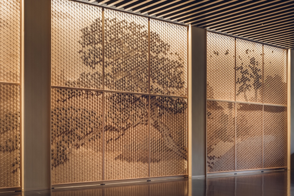 不使用任何釘子,僅憑精密木片嵌合勾勒紋樣的「組子細工」。以大量紋樣的疊合,交織出宛如繪畫般的精美創作。本作品以象徵日本庭園的「赤松」為核心,將光的移轉、風的流動、自然的蒼勁生命力,以及對訪客幸福的祈願,悉數寄託於職人之手。透過組子的細節紋理、金箔與鉑金箔的華美閃耀,疊加水墨畫的躍動感,多種技藝彼此呼應,讓整座空間彷彿化作庭園的延伸,展現極致空間美學。