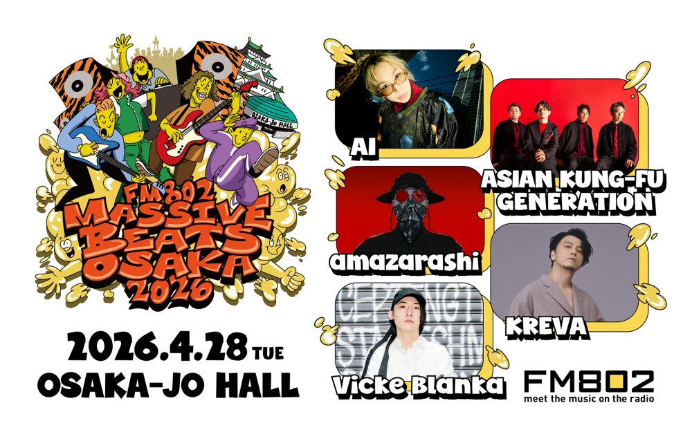 由關西大型廣播電台 FM802 主辦的音樂祭「FM802 MASSIVE BEATS OSAKA 2026」,將於 2026 年 4 月 28 日在大阪城 HALL 舉行。秉持「將日本引以為傲的音樂人與現場演出推廣至全世界」的理念,這場活動今年再度集結多組備受矚目的音樂人。演出陣容包括 AI、ASIAN KUNG-FU GENERATION、amazarashi、KREVA 和 VK Blanka。對於想在大阪感受日本現場魅力的台灣樂迷來說,這無疑是一場不能錯過的音樂盛會。