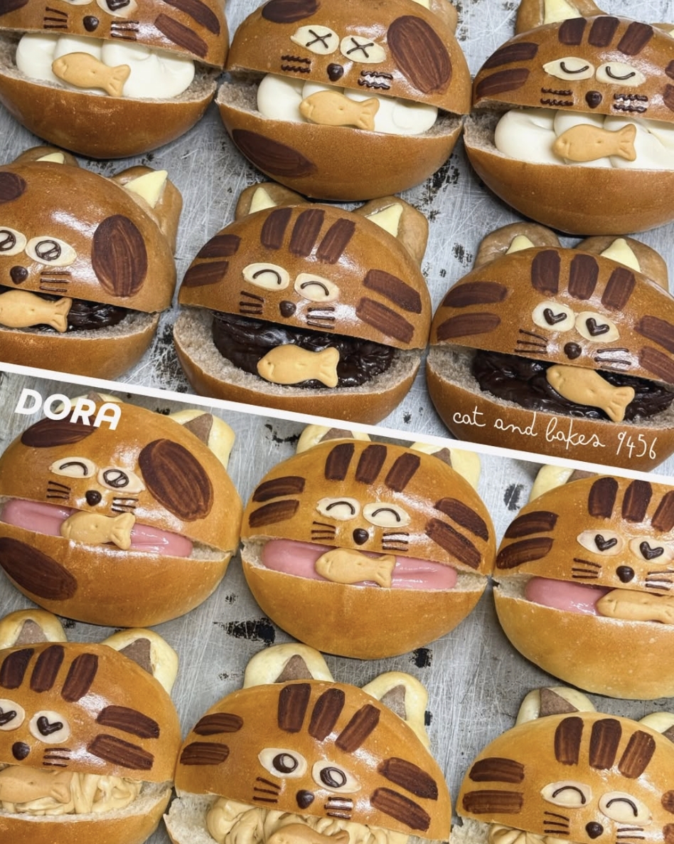另外也有包餡的貓咪麵包,內餡則為不同口味的奶油夾心,有花生、巧克力、卡士達牛奶,以及草莓(季節限定)等奶油餡。每塊麵包的貓咪表情也不盡相同。