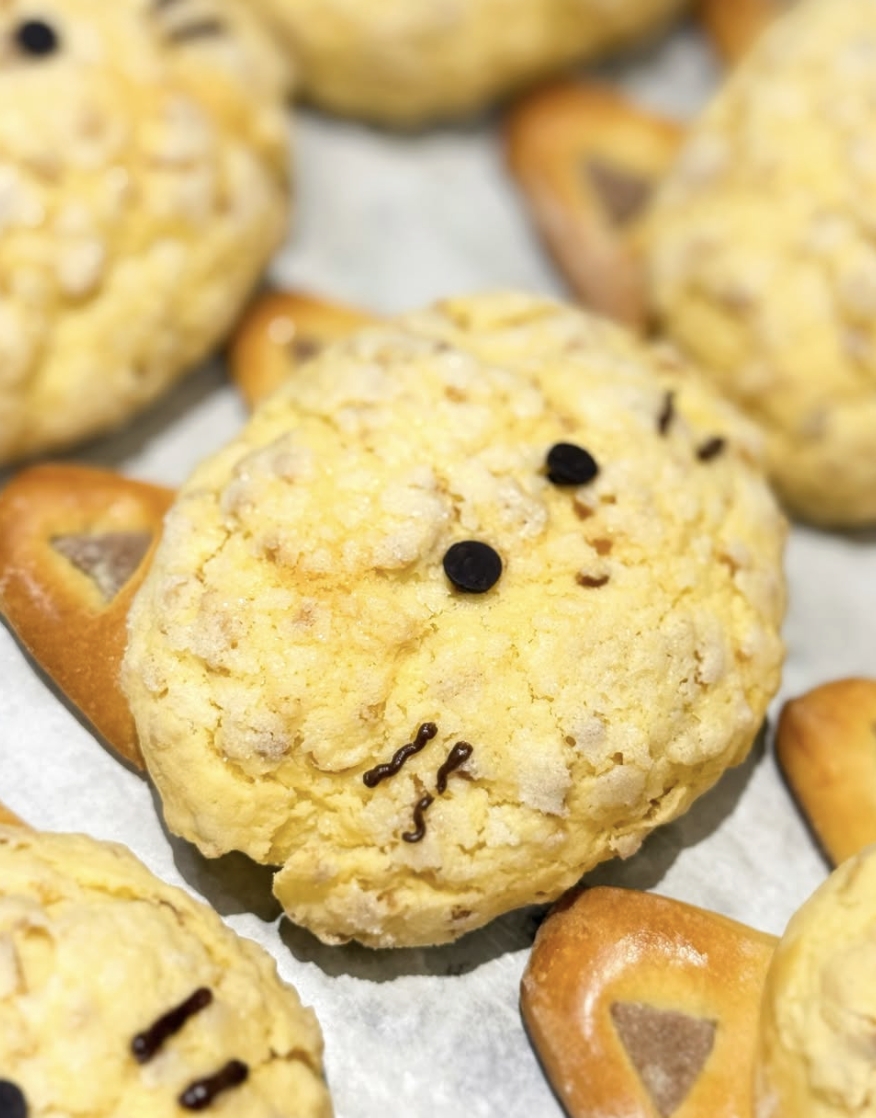 香甜中又帶點脆脆口感的貓咪菠蘿麵包,麵包上層的菠蘿脆脆部分還有加入花生粒,讓口感更有層次。