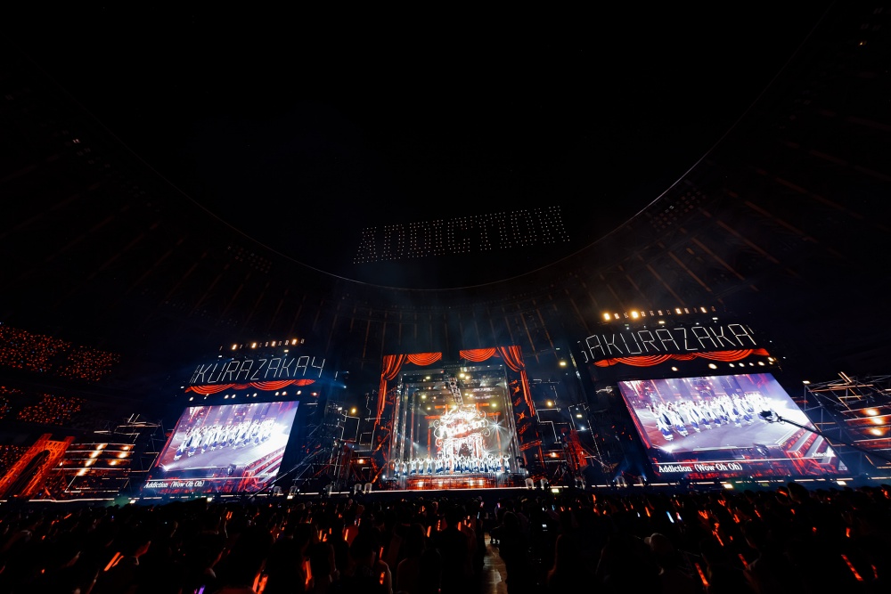 緊接著,大螢幕播放團員們直播的影像,不祥音效劃破空氣後,全場瞬間切換為一片紅色手燈海。重低音強烈的〈承認欲求〉接著登場,間奏中大尺度的舞蹈極具壓迫感,完美展現出屬於女性特有的「帥氣」感。隨後無縫接軌〈自業自得〉,C位山下瞳月在上段舞台的Solo展現出俐落舞步與無畏笑容,開場連續幾首歌幾乎不留喘息空間,將觀眾直接捲進櫻坂46的世界裡。