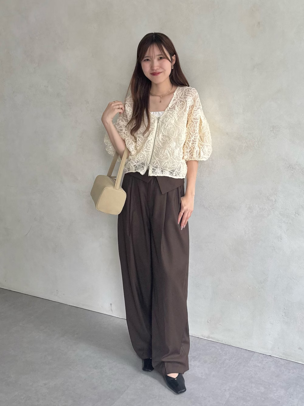 平時喜歡穿著優雅知性氛圍的你,不妨嘗試選搭蕾絲罩衫混搭,特色在於澎袖和短版的剪裁,穿著時能帶來上短下長的顯瘦比例,下身隨性加上打褶休閒西裝褲,同時點亮日系成熟的大人味氣息。