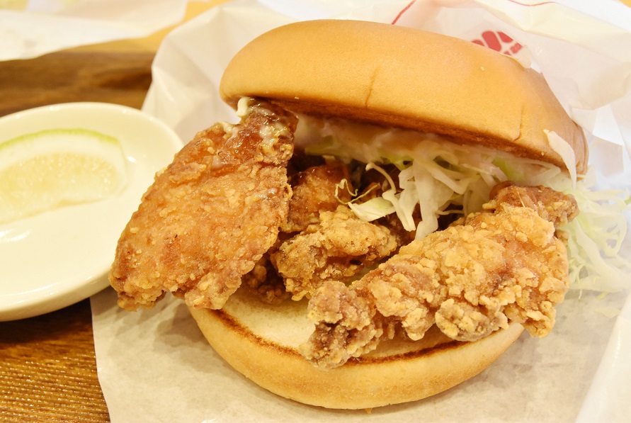 接著是「中津香檸炸雞堡」,口感並非酥脆而是柔軟,外皮可以吃到大蒜和醬油的口感,但和真正的中津唐揚炸雞塊相比,大蒜味比較沒那麼重,這是考慮到有些人會當作午餐吃而做出的調整。途中加上檸檬後,口感變得十分清爽,和釧路糖醋炸雞堡是截然不同的風味,平時的中津唐揚炸雞塊是不加檸檬的,似乎也是為了作成漢堡而加上的一點小巧思。