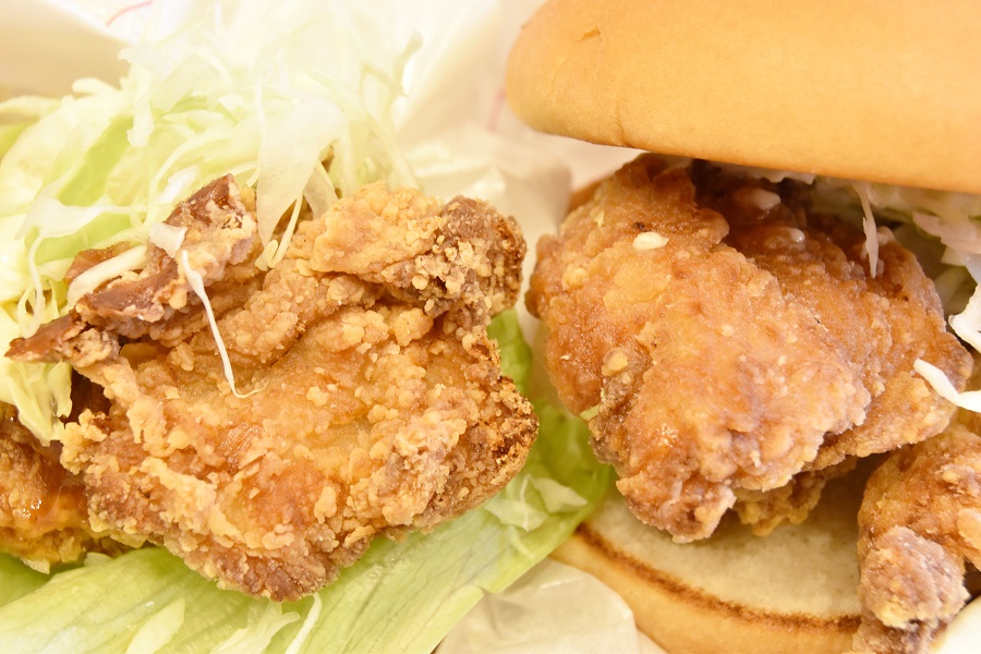 左邊的「釧路糖醋炸雞堡」的炸雞塊是使用泰國產的雞腿肉,表面凹凸不平。右邊的「中津香檸炸雞堡」則是使用巴西產的雞腿肉,外觀看起來是用了較多的太白粉。