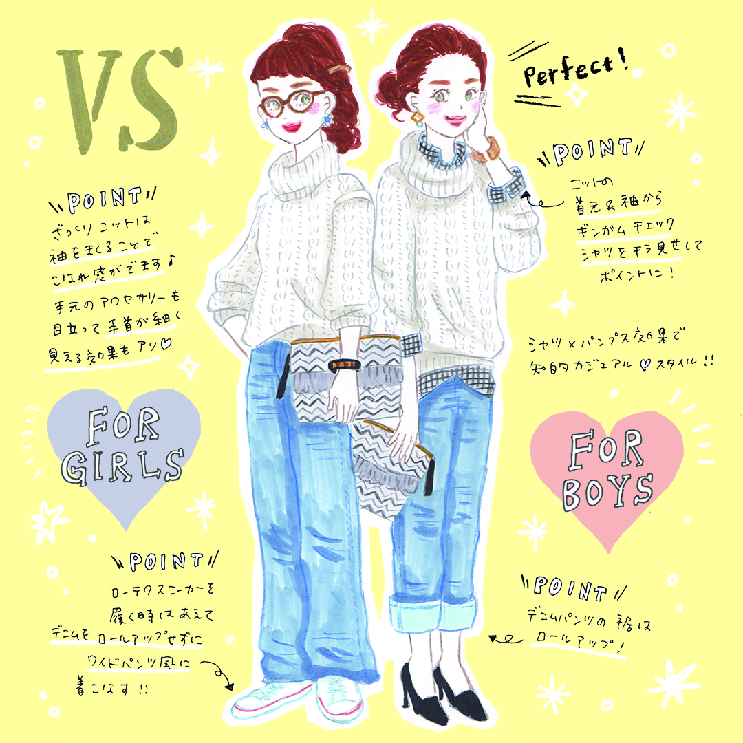 受男生歡迎的穿搭則是在毛衣裡搭上格紋襯衫,打造出知性的休閒風格。在頸部還有袖子、下擺的地方,讓人看到襯衫的花色可是一大重點。鞋子的話,穿上包鞋,還有再捲起丹寧褲管。絕倫的無造作感模特兒級穿搭完成♪