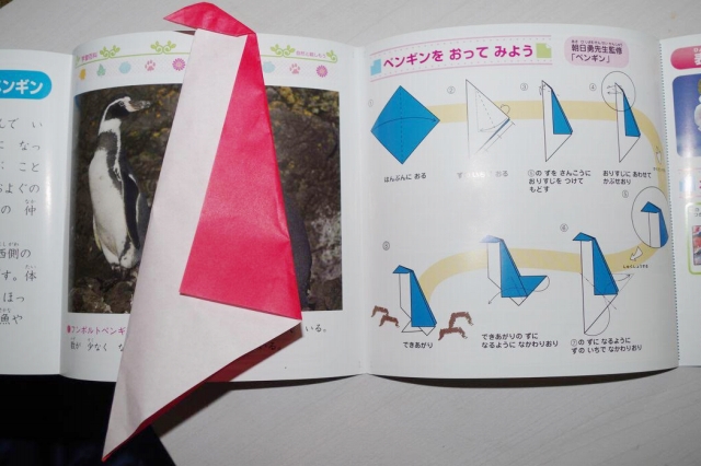 不只是小朋友們,我也想開啟好奇心之門! ……所以趕緊將『Japonica摺紙』拿到手啦。我想實際操作,動手摺出所多動物。手邊拿到的是「企鵝與花」,看著說明書,大概兩分多鐘就摺出企鵝了!