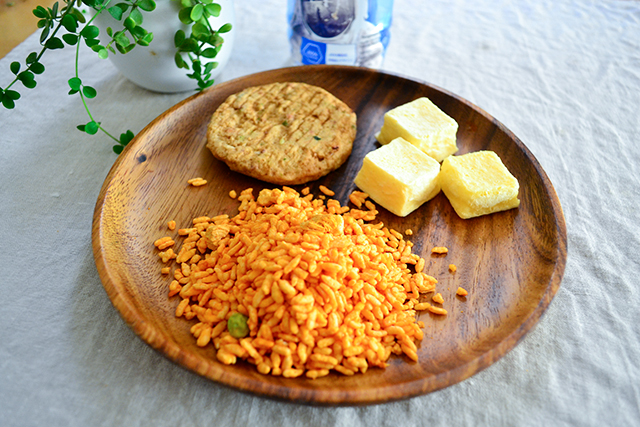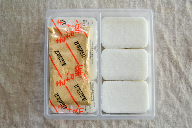 最後則是試吃「年糕」。此款是需要加水後變成恢復原樣的商品,現在就來試試看吧!首先打開包裝。內容物經冷凍乾燥處理的年糕和黃豆粉。