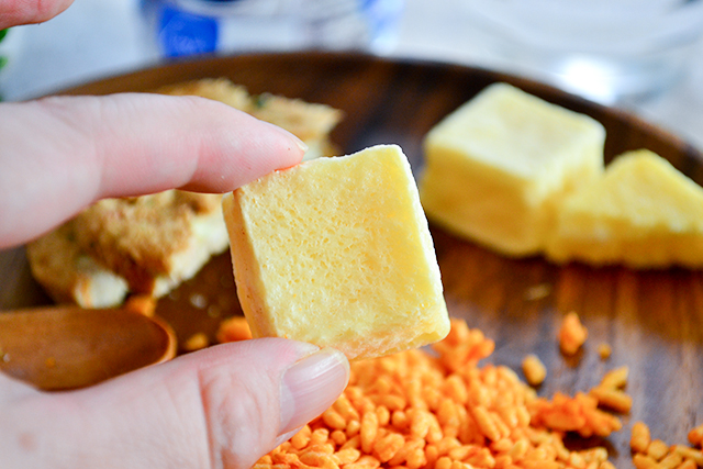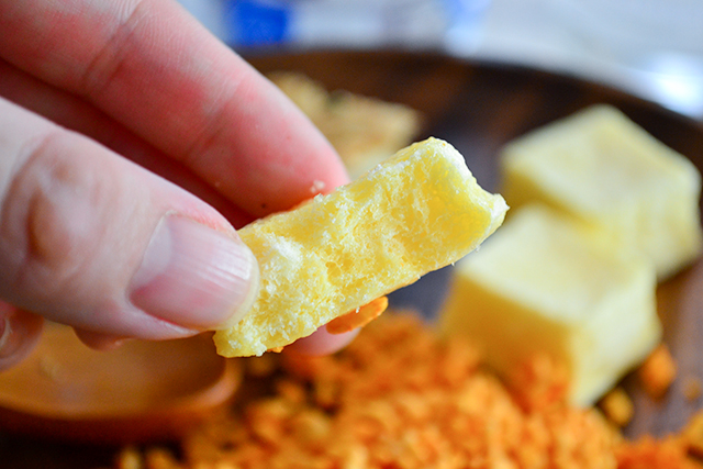 外觀呈現正方形的黄色塊狀。但味道就是正統的「布丁」喔!但真的會有入口即化的口感嗎?不過,這畢竟是冷凍乾燥的商品嘛~
