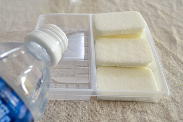 將年糕全部擺到同一邊後,在另一邊倒入水。這裡用的水也是會帶到太空的「宇宙種水」。