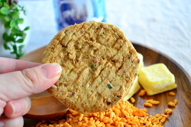 接下來試吃「大阪燒」。內容物為仙貝大小的迷你大阪燒,口感則因為是冷凍乾燥的關係所以很硬。