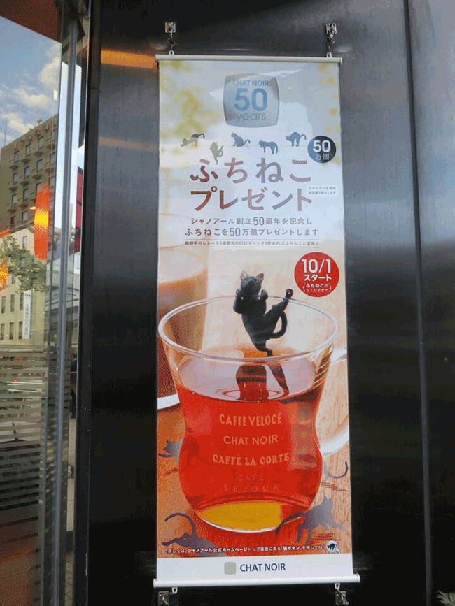最近店內慶祝50周年,點三杯飲料憑發票可以抽一個黑貓杯緣子,共有五種圖案,每種圖案都靈活的展示貓咪的神態,而且十分擬真,連腳上的貓掌都精細的表現出來!店內的飲料從190日元起,算是很平價的費用,最近有來日本的朋友可以留意看看唷!CAFFE VELOCE也很貼心的提供各分店的庫存查詢,大家可以先查詢附近的分店以免撲空唷~