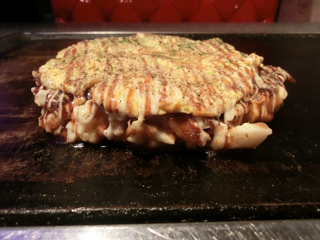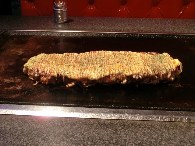 「鬼手佛心燒」是長長的摩登燒。在加入豬肉的炒麵飯(炒飯)裡放入半熟蛋還有很多的豬肉,份量十足。獨特的造型是以居酒屋的長型碟子為原型。藏田先生不管和風還是洋風,至今仍參考各式料理,努力的開發菜單。當然在菜單之中,也有上一代創業當時就留下來的豬肉大阪燒(480圓日幣)、烏賊大阪燒(480圓日幣)。