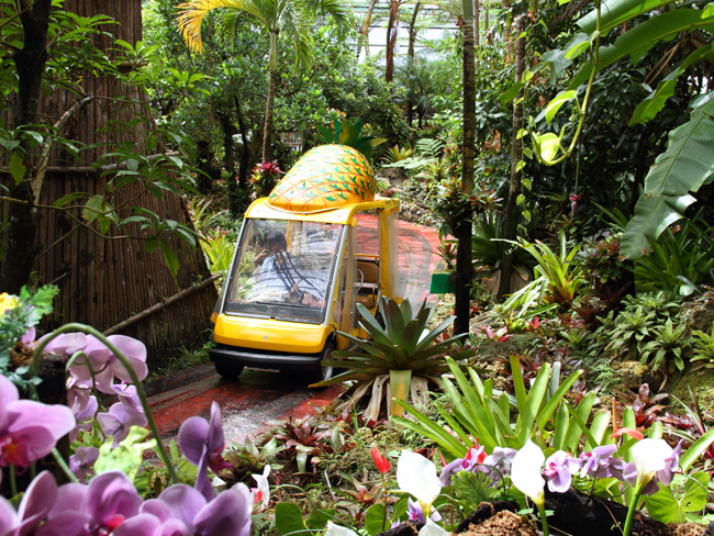 你可以在農田裡搭上安全自動駕駛的車輛,展開尋找鳳梨之旅,並好好拍照留下美好回憶。就如同穿梭在亞熱帶森林當中,行走於廣大的鳳梨田裡。這裡有超過一百種以上的鳳梨,能好好參觀這些鳳梨的成長過程!