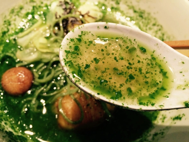 滋嚕滋嚕嚕(吸麵聲)……啊、真好吃!蔬菜味當中帶著海鮮風味。因為加了印度綜合香料和小茴香,所以也飄著一股咖哩風味。接著試試湯頭。