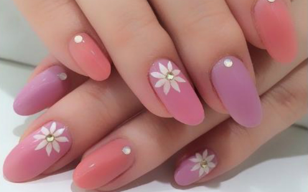 成熟可愛風的推薦款造型美甲☆ 加上小花圖案也相當可愛。