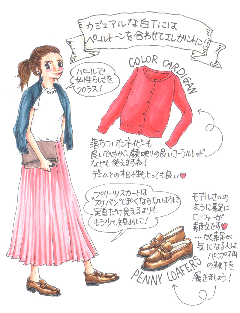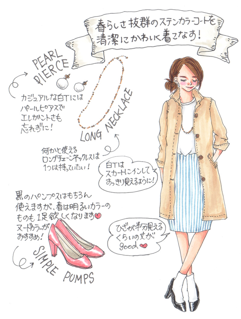 在這裡這個連載中,我將會介紹給各位,利用每個人手邊都擁有的基本款單品反覆搭配、不會太過甜美、具有潮流感、男孩子歡迎度超群,如此的最強穿搭。第2回合的這一篇,我要來介紹,不管和什麼顏色做搭配都搭得起來的萬能單品「白T恤」的穿搭術。將春天感超群的寬身大衣穿出俐落可愛!
