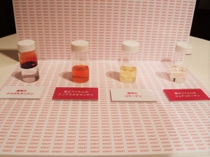 會場中展示了普通的蝦紅素和「奈米蝦紅素」以及普通的膠原蛋白和「純膠原蛋白」,如果聞看看味道的話,分成兩層的普通蝦紅素有一股沼澤地裡的海藻味,黃色的普通膠原蛋白則有一股腥味,飲料如果是這兩種味道的話會讓人沒辦法喝下去。而紅色的「奈米蝦紅素」和透明的「純膠原蛋白」的味道,雖然稱不上無味,但已經被抑制到幾乎讓人感覺不到的程度。