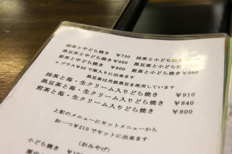 說到「時屋」的人氣餐點,就是銅鑼燒搭配茶飲的套餐了。銅鑼燒除了有一般的基本款銅鑼燒,還有加了一顆大栗子的栗子銅鑼燒,以及只限內用的鮮奶油銅鑼燒等,茶則有抹茶、煎茶、黑豆茶三種。雖然加了帶有濃郁甜味的鮮奶油的銅鑼燒也是店內人氣點心,不過筆者想推薦的是加了栗子的銅鑼燒。除了能夠享受到銅鑼燒原本的滋味,還能品嘗到栗子鬆軟香甜的口感,樸質而醇厚的韻味,只要吃一口就會上癮。要點套餐的話,建議選擇使用丹波黑豆,香氣濃郁、口感滑順的黑豆茶。黑豆茶和銅鑼燒非常相搭,配著茶將銅鑼燒一口咬下,就能享受到哆啦A夢最愛的滋味。
