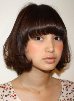 髮長及下顎的水平鮑伯頭。水平修齊的髮尾超微弄捲,就予人柔和的女子感。