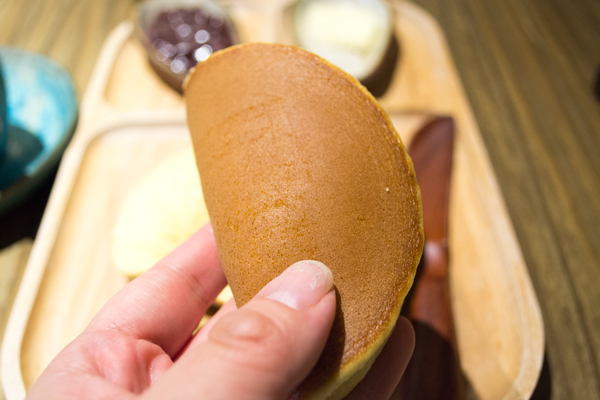 喔喔! 香香甜甜的味道撲鼻而來。然後,表面潤澤的感覺,看起來和普通的鬆餅明顯的不同。真的一整個就是銅鑼燒的皮。
