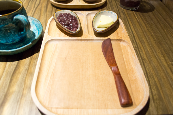 一面喝著咖啡一面等待,然後每桌有盤子端了上來。在這盤子上面還沒有放鬆餅。在現烤好的鬆餅送過來之前,就先這樣等待著。現烤銅鑼燒的皮與發酵奶油與紅豆泥的結合!