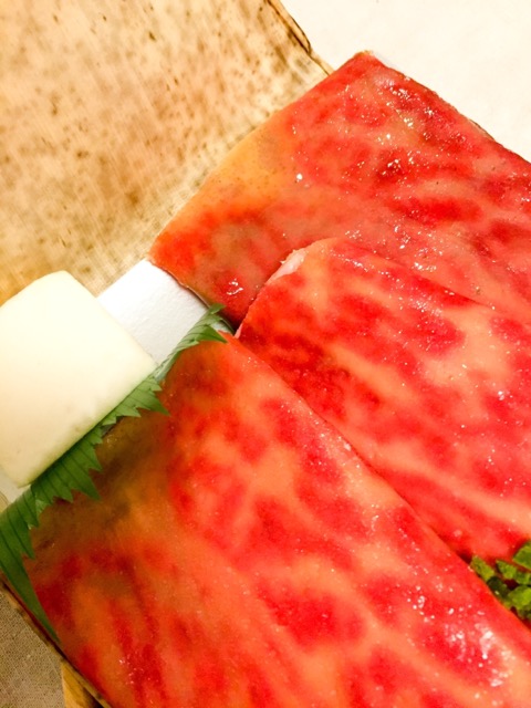 不管從哪個角度看都是「肉」! 稍微看得見的紅肉部分中的霜降油脂看起來很好吃。把包裝打開後…。