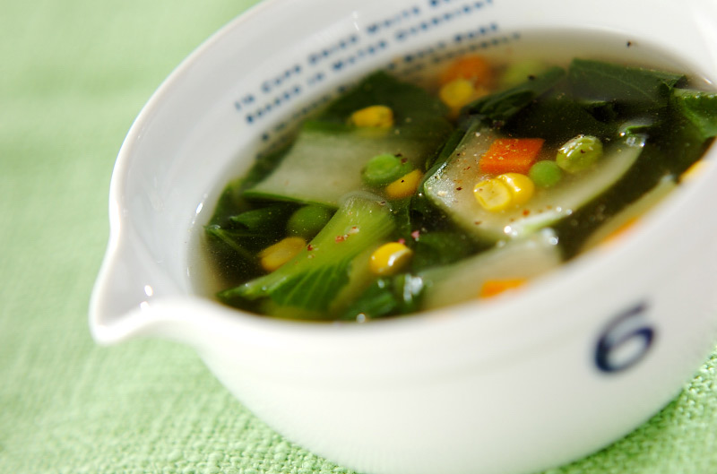 材料(4人份)青江菜:1棵三色豆蔬菜(冷凍):1/2~1碗份<湯>雞湯塊:2個水:800ml<太白粉水>太白粉:1大匙水:2大匙胡椒鹽:適量【事前準備】