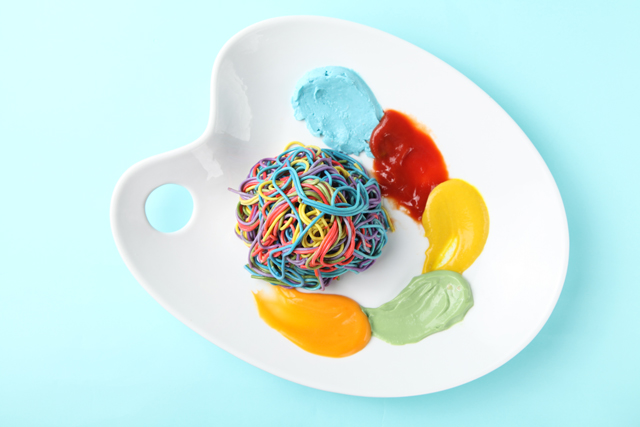 這道料理乍看之下會讓人以為是「橡皮筋」,其實它是義大利麵。料理名稱叫做「彩虹義大利麵」(1300日圓、未稅)。是道色彩繽紛的辣椒油炒義大利麵。小編試吃過後覺得很美味喔!