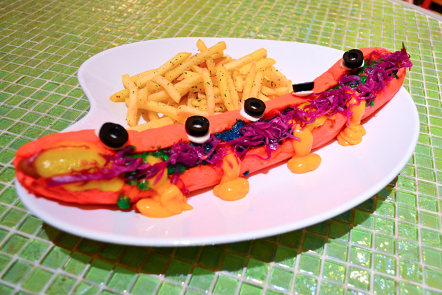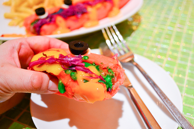 根據店員所説,就是「鬆軟的螢光粉紅麵包淋上看起來毒性劇烈的彩虹色澤起司製成的熱狗」。彩虹色澤起司到底是什麼呢?「粉紅—“毒”熱狗」終於上桌了!