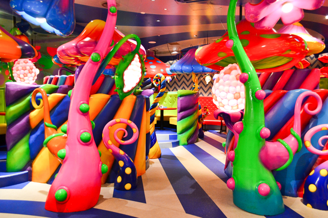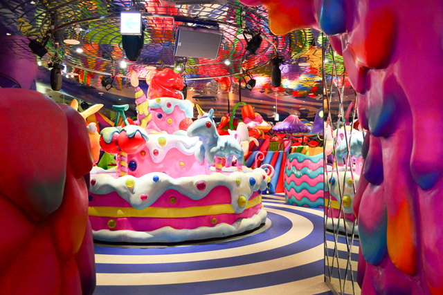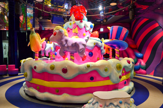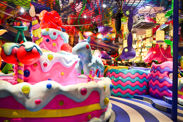 眼前是螢光粉紅色蛋糕形狀的旋轉木馬「SWEETS GO ROUND」。雖然不能乘坐,但在表演時,店內的視覺人物「MONSTER GIRL」便會站在上面,並伴隨著閃亮的燈光一起旋轉。