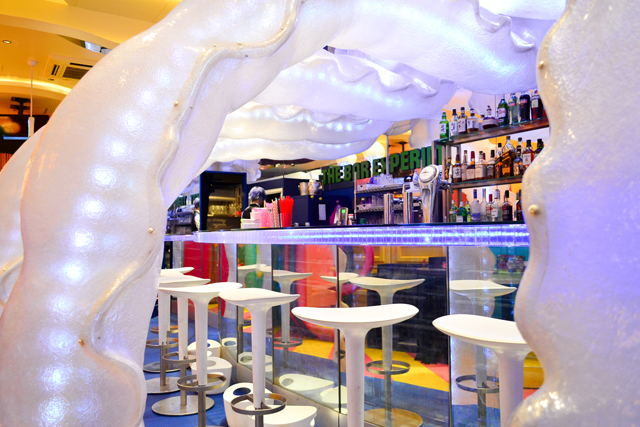 以巨大的水母為雛形的吧台酒吧「BAR Experiment」。是個水母的腳覆蓋著頭頂的不可思議的空間。晚上此區好像會閃著奇怪的光芒喔……。■Mel-Tea ROOM