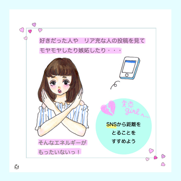 直到失戀傷口完全癒合以前,一律禁止接觸像是Facebook、Twitter等,曾經喜歡的人、或與他有關聯的人可能出現的社群網站。即便是某人發布生活充實愉快的照片等等,這類與前段戀情毫無關係的內容,都有可能讓失戀友人看了之後心情更糟。所以要避免雪上加霜,索性就讓她先斷絕所有工作以外的網路世界。