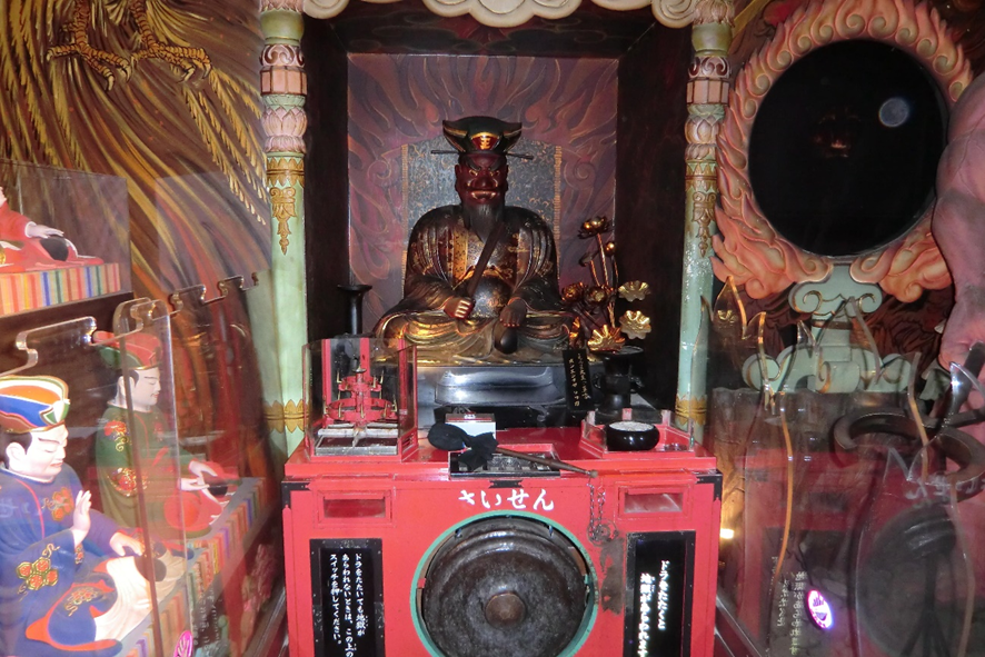 引用等待訪客的是滿臉通紅的閻羅王,威風凜凜地安坐於正中央,旁邊有穿著紫色與綠色等彩色服飾的地獄判官。敲打閻羅王的銅鑼之後,就會開始解說地獄的事情,往旁邊一瞧……