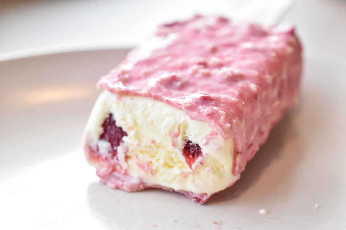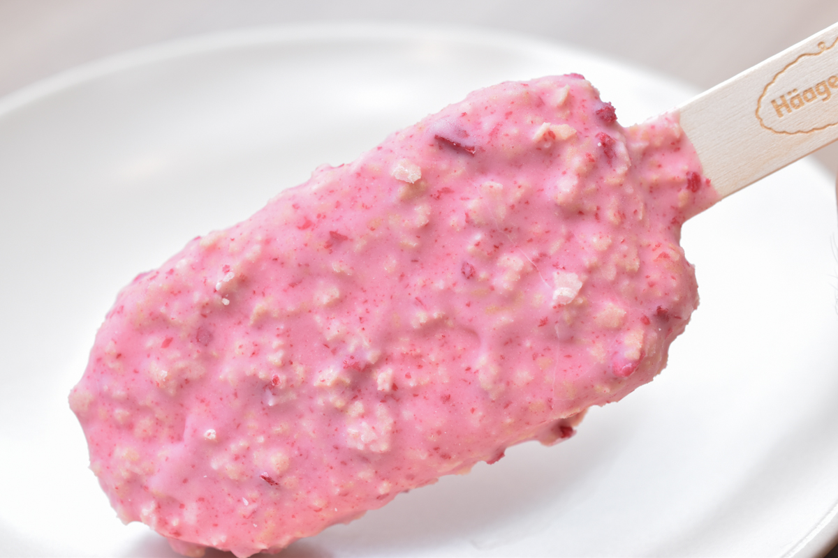「覆盆子卡士達」,是外層包裹了巧克力的冰棒型新商品。在外層方面,第一次使用了法式薄餅(feuillantine)脆片。所謂法式薄餅脆片,指的是將烤成薄薄的可麗餅餅體壓碎成細小碎片狀。至今為止的巧克力外層,即使脆脆的口感很好,但在口中卻很快就融化了,而這種法式薄餅脆片的酥酥脆脆感則一直持續了很久。