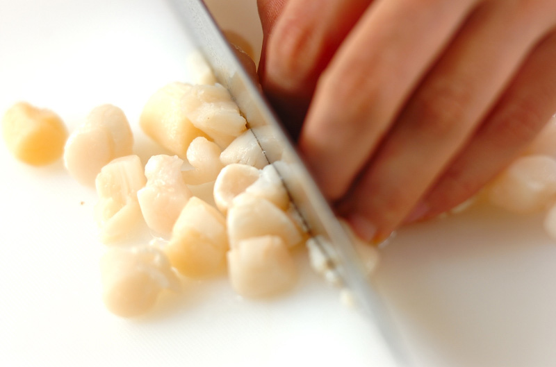 若扇貝是冷凍的話,請使用熱水川燙後去除水氣,並切塊。