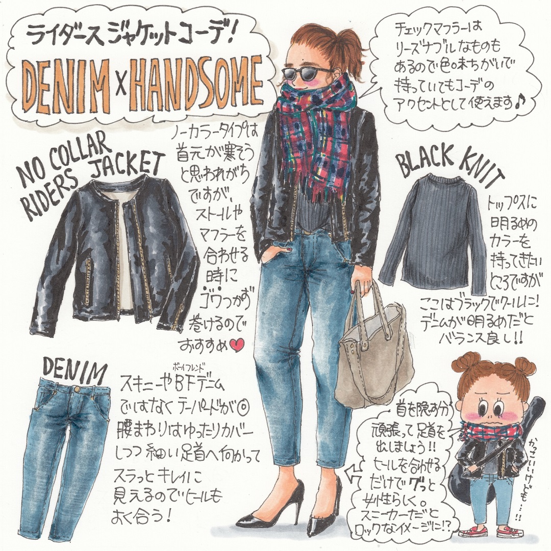 大家好。我是時尚插畫家Iwatamai。在這次的連載中,將介紹每次隨機而定的服裝主題,其搭配還有選擇的方法♪這次要介紹給大家的主題是『騎士外套穿搭』。
