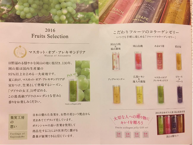 日本岡山地區,由於面臨瀨戶內海的關係,其環境受瀨戶內海調節的關係,可以種出許多美味可口的水果。但水果由於保存期限短且運輸上容易因為碰撞產生傷痕,因此不容易配送到日本各地,於2011年創立的「果實工房」不僅想讓各地的日本人都能夠吃到岡山產的美味水果,且考慮到現代人上班繁忙,較沒時間洗水果、削皮等,因此想到將水果最成果凍的方式,不僅可以吃到水果原本的味道,還能省去麻煩的洗淨、削皮過程,根本就是一款懶人救星甜品,且更棒的是他們還在果凍中添加膠原蛋白,讓吃的人不僅可以嘗到水果的味道,還能吸收膠原蛋白,這種一舉兩得的食品,現在可是在日本女性間大為流行喔!