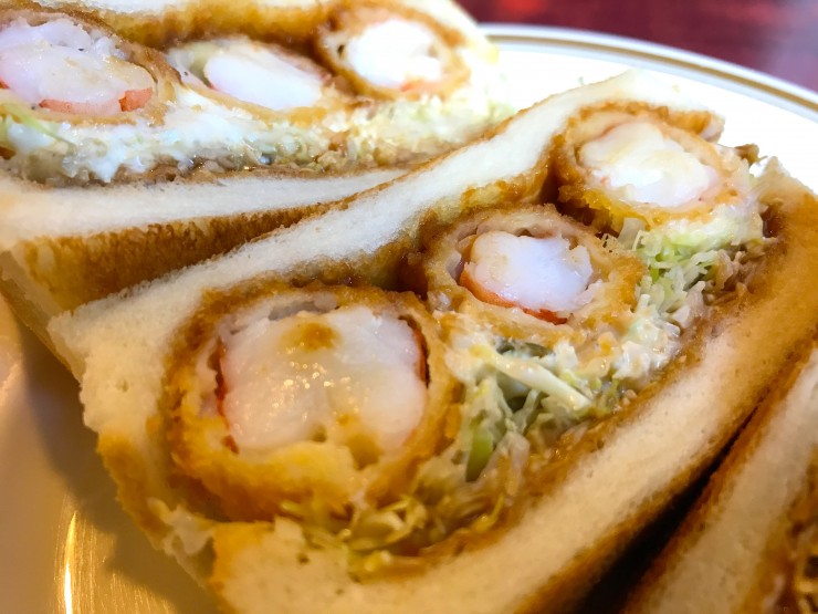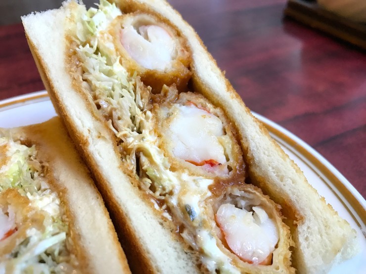 身為淺草的純咖啡廳名店的其中一家,儘管擁有各式各樣的餐點,但在這當中最想推薦的就是炸蝦三明治。使用三條肥美蝦子的炸蝦三明治貨真價實。說到炸蝦三明治,名古屋的KONPARU是很有名沒錯,但淺草的這家也不輸它。和KONPARU的炸蝦三明治不一樣的地方,首先是蝦子的大小。