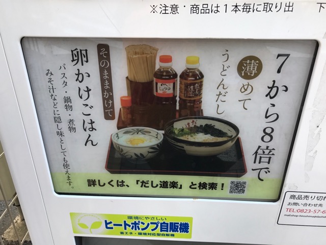 位於廣島縣吳市的「烏龍麵店 湯頭道樂」是二反田醬油直接經營的烏龍麵店。這家店引以為傲的是放進整個被稱作「下巴」之用炭火烤過的飛魚「烤下巴」與「昆布」的「湯頭道樂 烤下巴」。這個「湯頭道樂」,據說可以在自動販賣機買得到! 雖然這麼說,但有賣的也只有少數的自動販賣機。這次,前去尋找這個「湯頭道樂」的自動販賣機。設置在普通停車場的「湯頭」自動販賣機