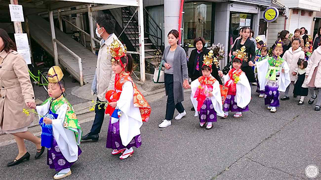 「菜種御供大祭」將於油菜花盛開的3月25日登場。菜種指的就是油菜花,不僅可用來搾油或充作食材,在日本也是人氣居高不下的觀賞植物,自古以來便常常成為俳句和童謠的題材,對日本人來說是日常生活中相當親近的植物。祭典上將供奉以梔子花果實所染製而成的菜種色糰子,好為道明寺天滿宮之神菅原道真公加以慰靈。作為宣告春天來臨的一大盛事,在本神社所座落的大阪府河內地方,本祭典也往往被暱稱為「河內春事」。相傳在祭典上供奉過的糰子具有治癒百病之效,從祭典前一天的24日至26日之間,任何人都能前來求取。「稚兒行列」則是本祭典的一大重頭戲,由幼兒們穿上和服在附近遊行,並將菜種供奉至神前。這幅令人不禁會心一笑的光景,將於祭典當天13:00登場亮相。1.穿上小小和服,手持油菜花踏步遊行