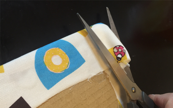 4)瓦楞紙板側邊和邊緣也塗上接著劑,然後將布折過來。