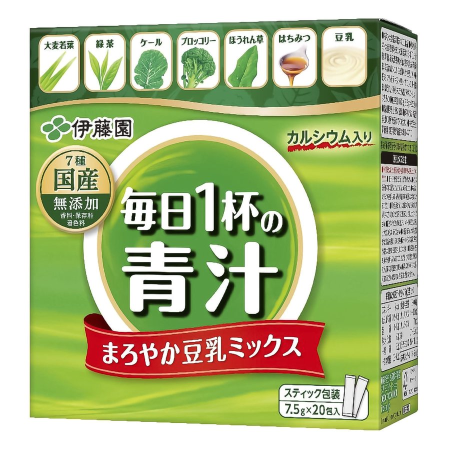 日本飲料大廠伊藤園推出的青汁,萃取日本產的大麥若葉、綠茶、花椰菜、波菜及甘藍菜,特別加入豆乳和蜂蜜的成分,讓青汁喝起來時更爽口好喝。